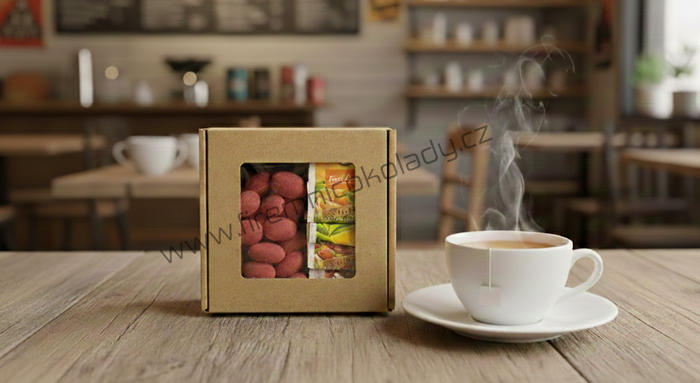 Set 100 g mandle bílá čokoláda/malinový prach + čaje TEEKANNE